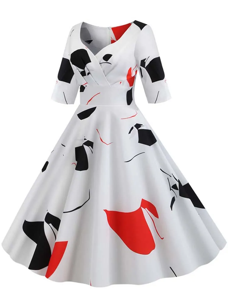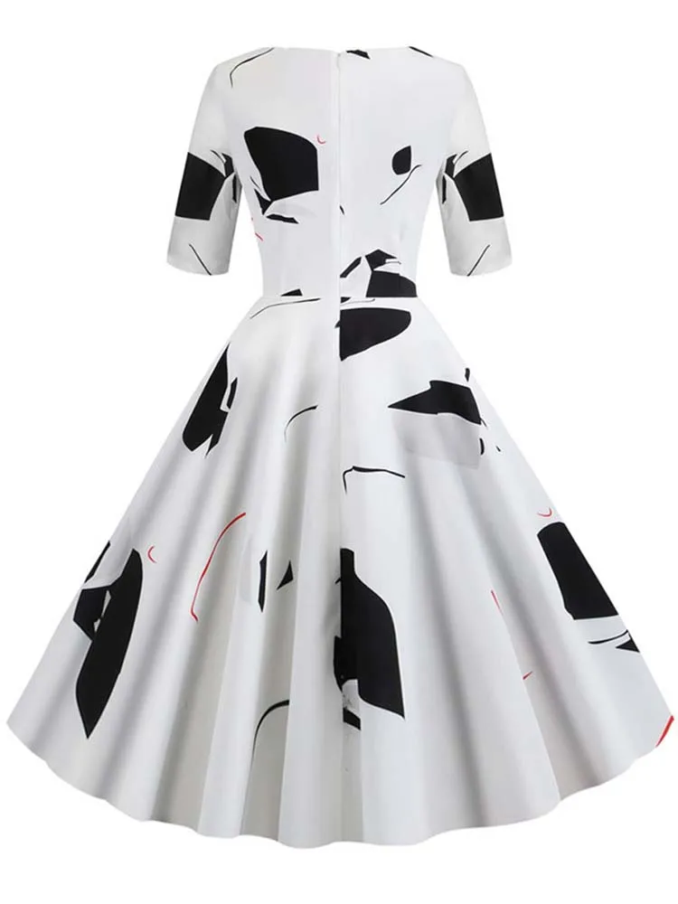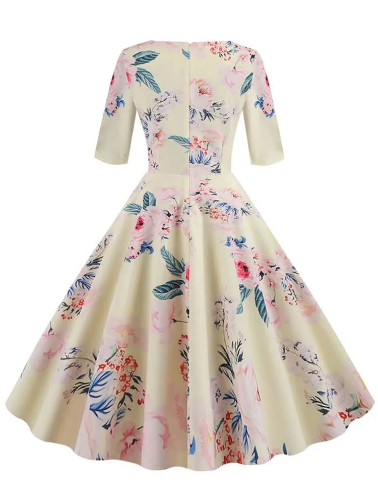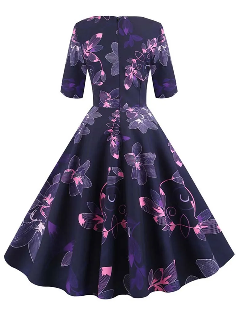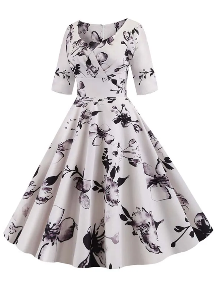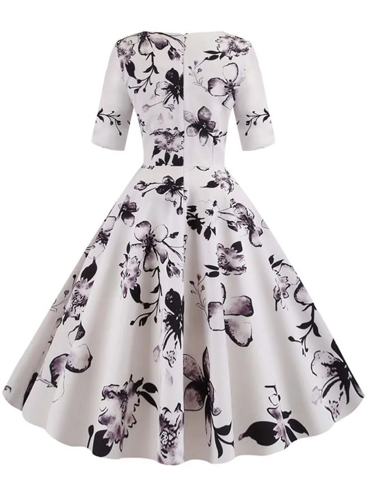 Half Sleeve Black Summer Women Dress Floral Print Vintage Party Dresses Robe Casual Retro A-Line Vestidos 1