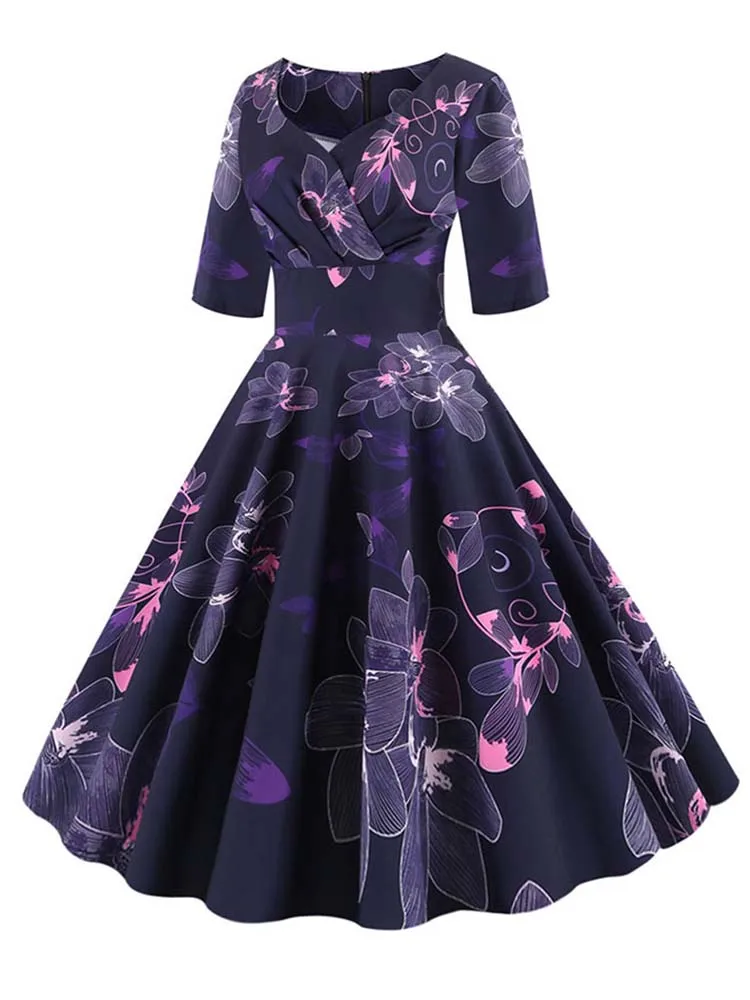 שמלת קיץ שחורה חצי שרוול לנשים הדפס פרחוני וינטג’ שמלות מסיבה גלימה מזדמן רטרו אונליין Vestidos
